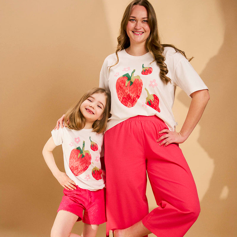 Oh, what a cute children’s t-shirt in coral. It is made of super soft and textured slub cotton. The shirt has a dropped shoulder line, straight cut, and sleeves with double frills. So cute!