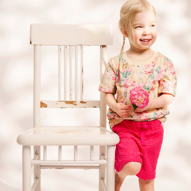 Lovely culottes trousers have straight and wide legs, and they are made from super soft terry material, with a lovely wavy embossed pattern. The comfortable trousers have an elastic waistline with a drawstring. For fun and active summer days!