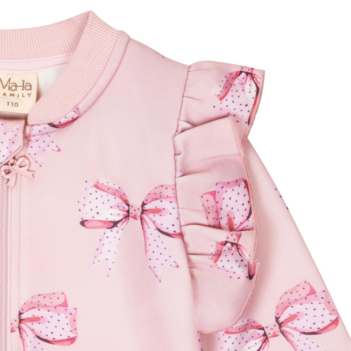 New from Maia! Children's high-quality track jacket with the nostalgic Rosette print has a dim shine. The jacket's material includes recycled polyester, and the inner layer is very soft cotton. The jacket has long sleeves, pockets, cuffs at the collar, cuffs, and hem, a zipper puller cover at the chin, and adorable frill details on the shoulders. Designed in Finland.