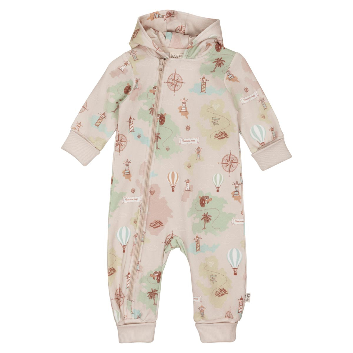 Babies' overall is made from soft organic cotton blend, and it features the charming Route print. The overall has long sleeves, a lined hood, and a long zipper that helps with getting dressed. The overall has ribbed cuffs on the sleeves and legs. Designed in Finland.